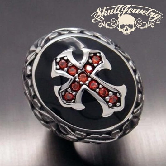 The End Time - Cross Ring With Blood Red Inner Stone & White OR RED Zircon Cross Stones