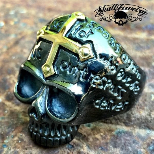 BLACK FRIDAY DEALS • LIVE NOW 🔥BLACK 'Lords Prayer' Skull Ring with Gold Cross on Forehead (#455)