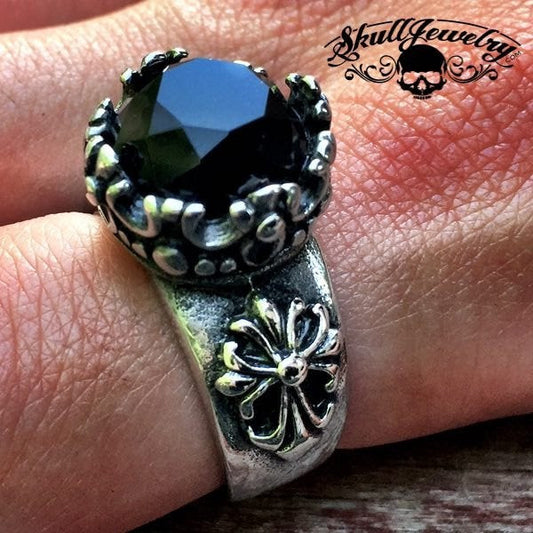 BLACK FRIDAY DEALS • LIVE NOW 🔥Return of the "Gypsy Queen" Faceted Rectangle Onyx Gem Stainless Steel Ring with Crosses (#346)