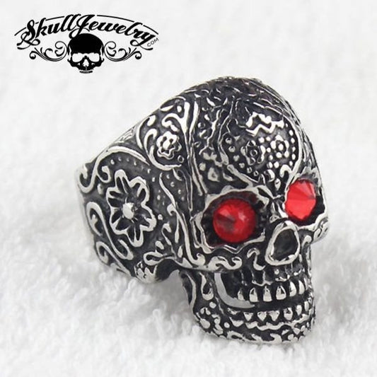 Buy American 🇺🇸Calaveras - Vintage Flower Skull Ring w/RED Eyes (#477)